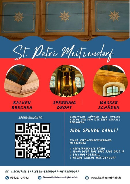 Die 500 Jahre alte Kirche St. Petri in Meitzendorf hat im Laufe der Jahre an unterschiedlichen Stellen Schaden genommen. Besonders betroffen ist das Dach und die darunter liegende Balkenkonstruktion. Eine kurzfristige Reparatur kostet jetzt schon 15000,00 Euro, ist aber nur ein Tropfen auf den heißen Stein. Wir bitten deshalb dringend um Seeboden, um das Gotteshaus in seiner Substanz zu erhalten. Hier der Link zur Spendenseite der Kirchgemeinde Wolmirstedt.